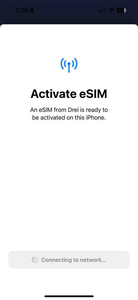 I have no idea who Drei is and cannot remember if this or something similar came up during my Singapore install. From what I can Google, Drei is another eSIM provider that I guess Nomad may have a partnership with. I am just guessing though. Anyway, at this point, the only option is to press continue. This is where the install literally gets stuck.
