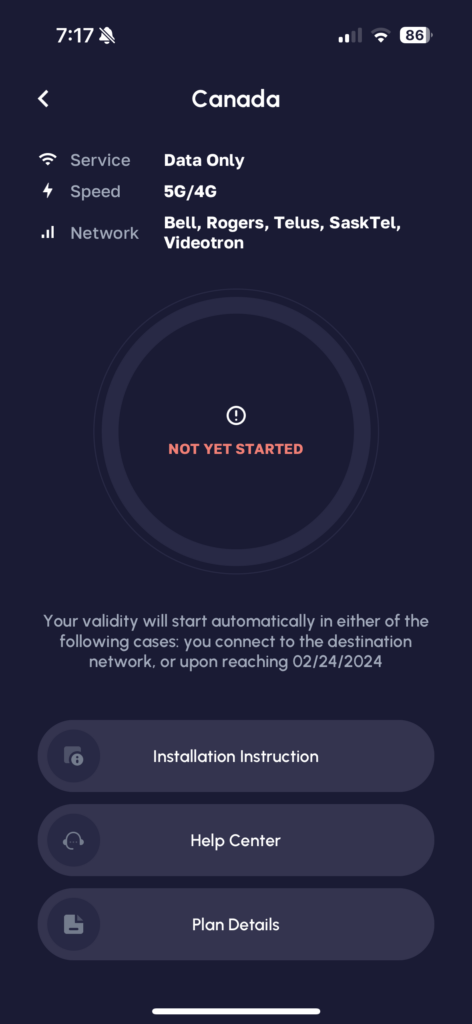 I think it got stuck on this screen as I was installing the card in my home country and not in Canada. The eSIM just does not have anywhere to connect to. Swiping around (from memory it is a swipe up on the iPhone) gets you out of this screen and onto the final screen.