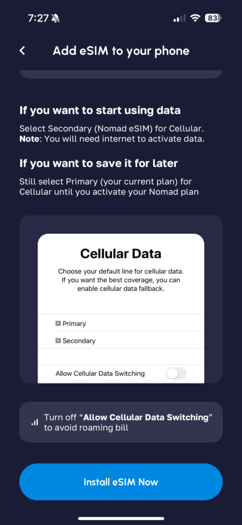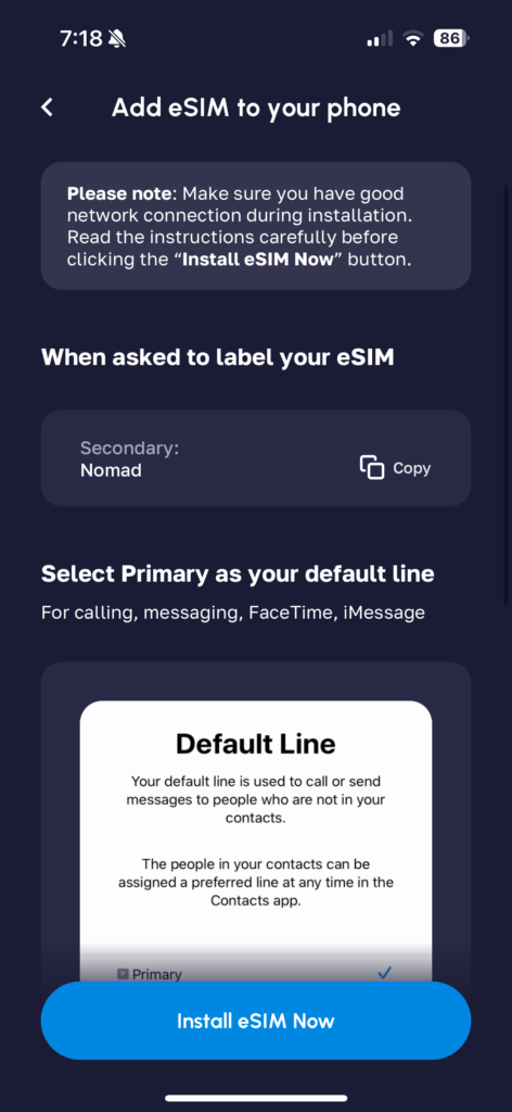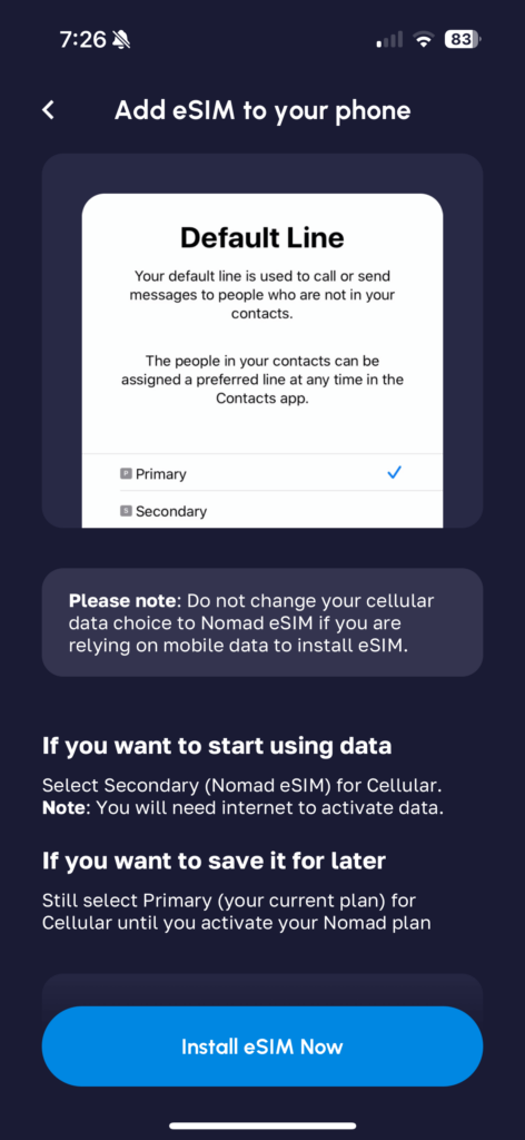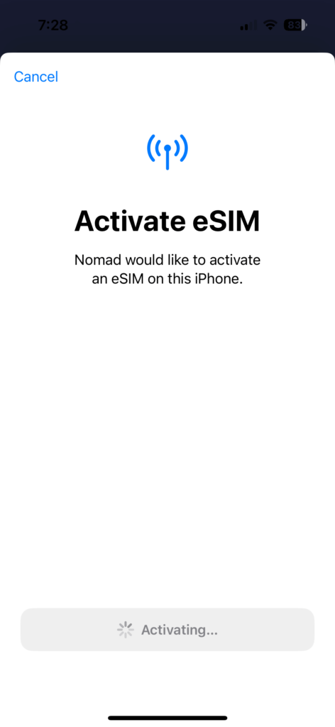 Now, somewhat confusingly, after activating the Nomad eSIM, this next screen came up