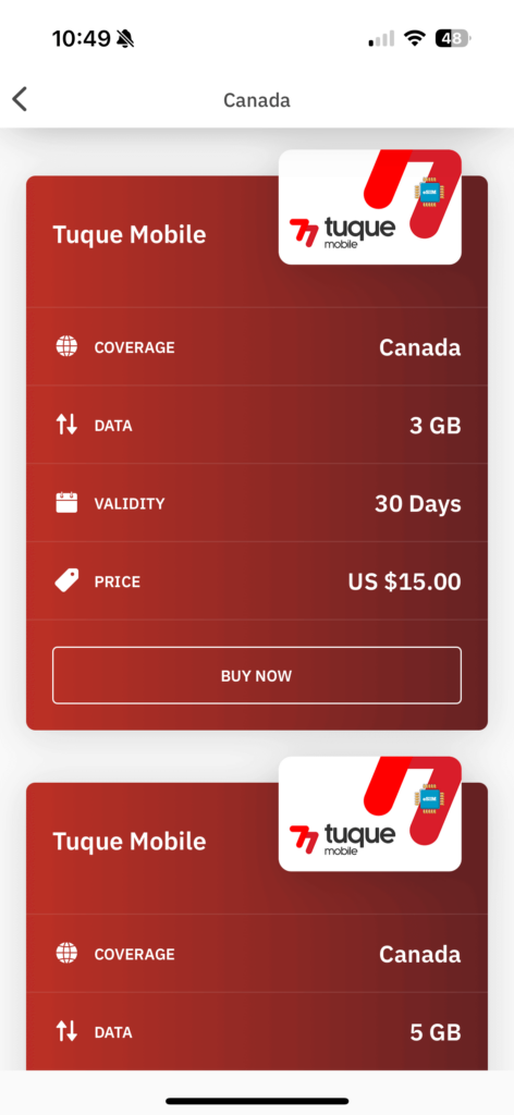 Airalo would probably be the best known alternative to Nomad. After all, they were the world’s first eSIM store. As already mentioned, they cover an even greater number of countries and regions than Nomad does. They are definitely worth a look but I think you will find that Nomad’s prices and overall value for money are a bit better. You can see here how Airalo’s 3 GB Canada plan compares to what I paid with Nomad. There is about a 50% higher price difference after my coupon use.