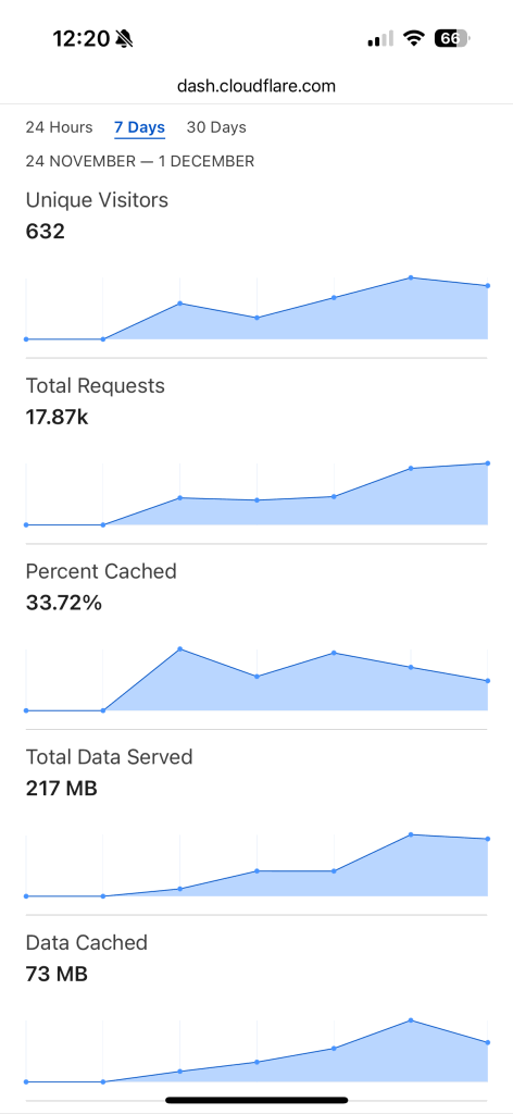 The main difference that I can see between the two apps is the lack of stats in the the WordPress app. I’m not too fussed with that as I look at Google Analytics and Cloudflare’s statistics more. In the 7 days since I installed them, I’ve gotten the following data: